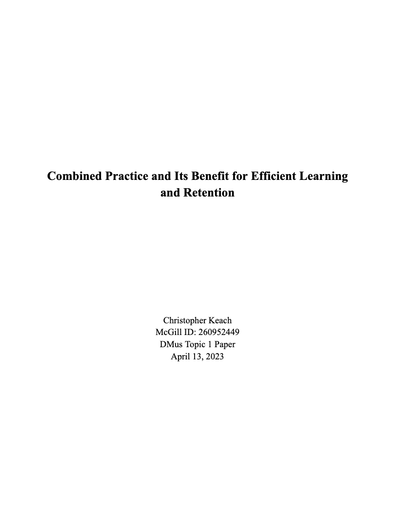 One of Christopher’s recent research project is his dissertation, which focuses on efficient practice and its effect on long-term learning and retention. Thus far, he has written a blog post about combined practice, as well as a paper on the goals and reasonings of his upcoming study. Both of these sources can be found below! His upcoming study will be on the effects that different practice techniques have on long-term retention; more information can be found by contacting him here.